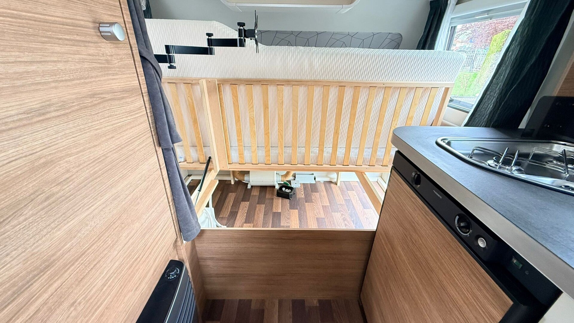> Opbergruimte onder het bed te bereiken door het grote Serviceluik en door liften van het Dwarsbed (d.m.v. gasveer)