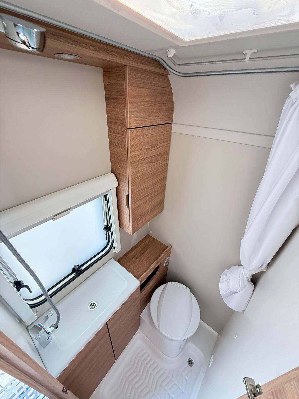 > Bij binnenkomst links vindt u het toilet- en wasruim deel mét douche uitrusting, het toilet is een draaibaar Cassettetoilet